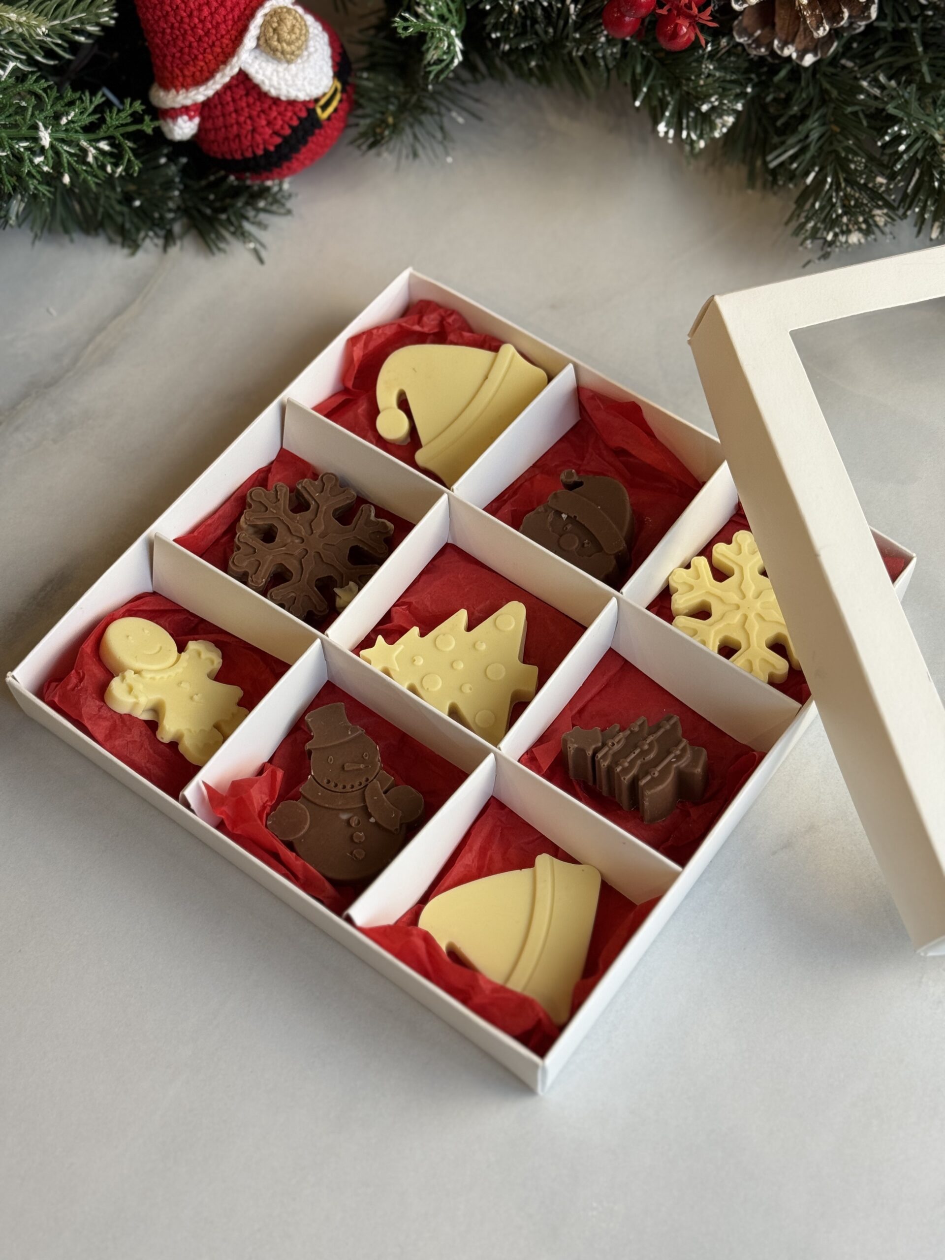 На выбор может быть белый, молочный или черный шоколад в новогодней тематике